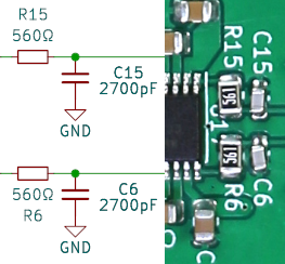 In our case, we're going to solder one 0603 resistor per channel, on top of C15 and C6.