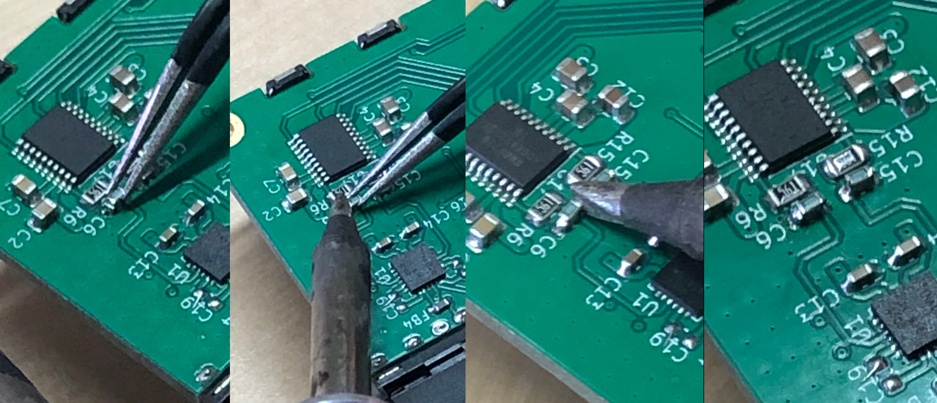 Soldering this together is fairly easy as SMD work goes, since we can place the new resistors directly on top of the capacitors: