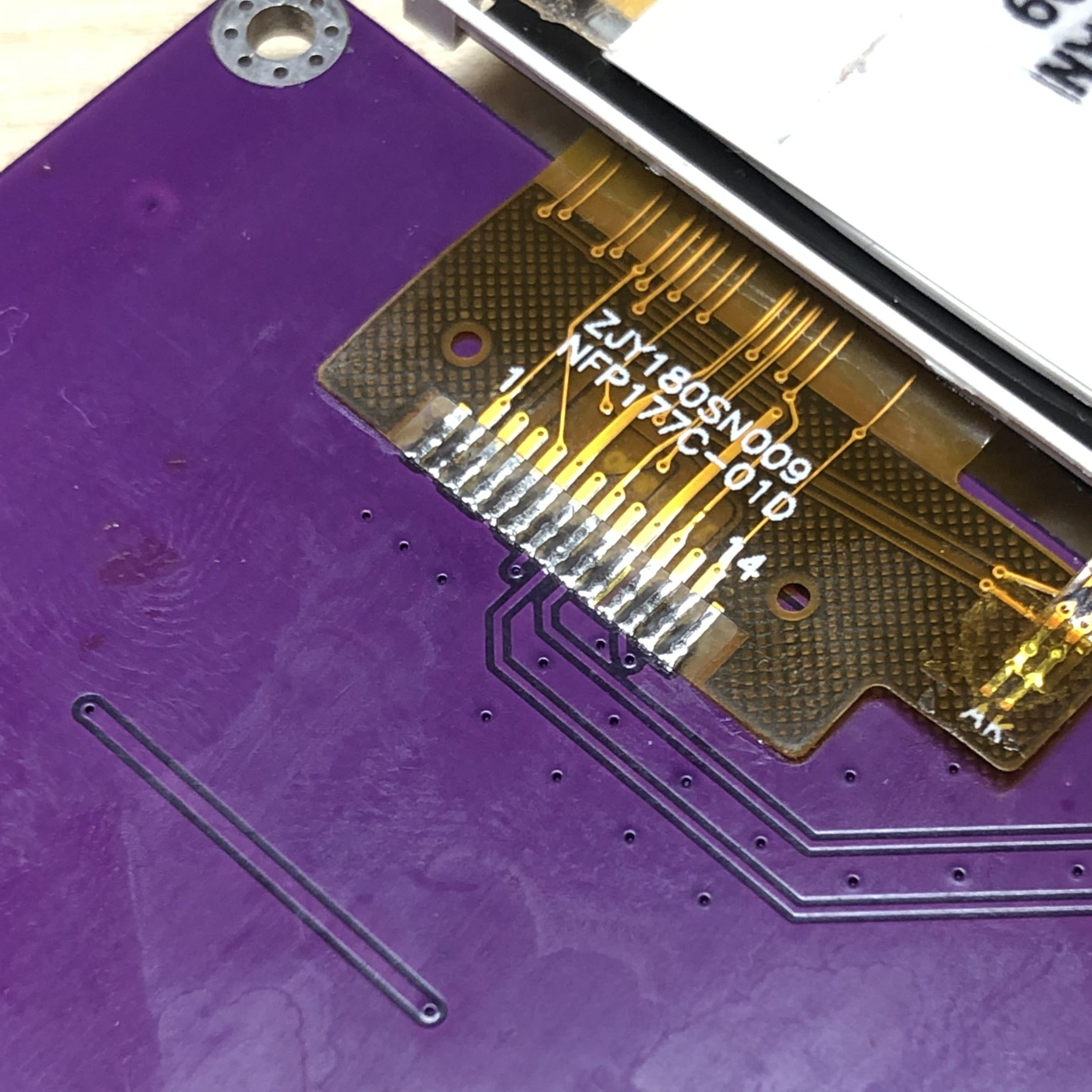 The display may seem intimidating, but there's a trick to soldering it easily: first ensure your iron is well cleaned and tinned. Then, lay down some flux over the pads. Next, line up the display's connector and solder one pad. Double check the alignment, then solder the pad on the opposite end. Lastly, go back across every pad until everything looks properly soldered.