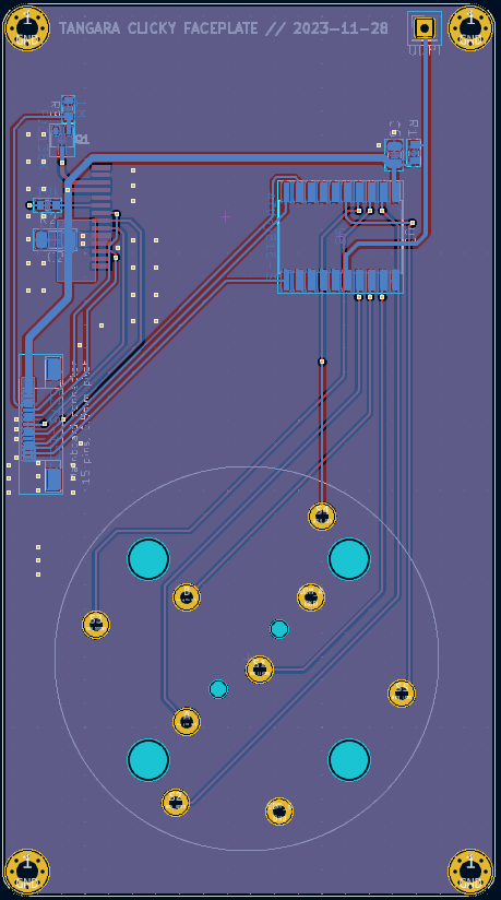 Similar to the schematic design, we can start with most of the work done for us by copying the standard Tangara faceplate PCB and then deleting the components, fills, vias, and traces that we don't need (KiCad can even do most of this for us automatically).