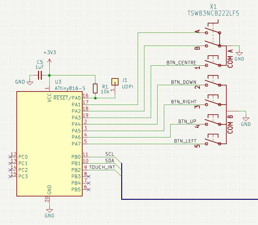 To act as an interface between the encoder and the ESP32, we'll be using a small microcontroller. I happened to have some Microchip ATTINY816s left over from a previous project and they're very easy to implement (although flashing is a slight pain), so I'll use one of those.